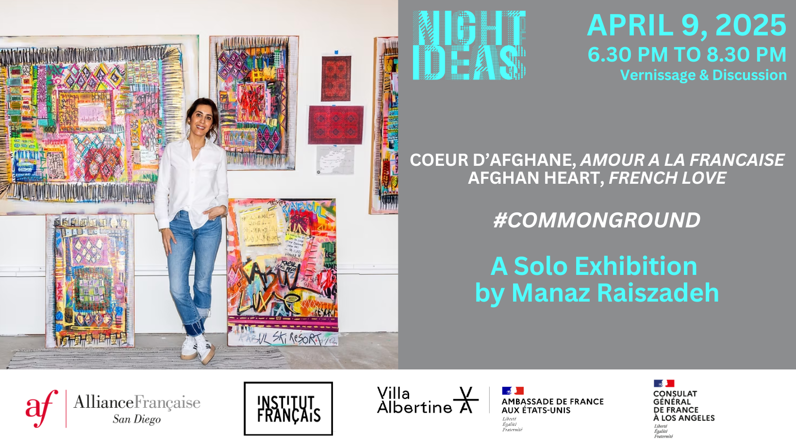 Join the Alliance Francaise San Diego to welcome Manaz Raiszadeh for the vernissage of her solo exhibition, COEUR D’AFGHANE, AMOUR À LA FRANÇAISE (Afghan Heart, French Love), organized in the spirit of the Night of Ideas.